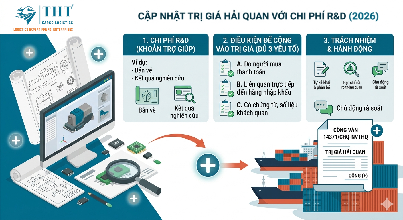 CẬP NHẬT CÔNG VĂN 14371/CHQ-NVTHQ: XÁC ĐỊNH TRỊ GIÁ HẢI QUAN ĐỐI VỚI CHI PHÍ R&D Cơ quan Hải quan vừa ban hành Công văn 14371/CHQ-NVTHQ (24/03/2026) hướng dẫn về việc xác định trị giá hải quan đối với chi phí nghiên cứu và phát triển sản phẩm (R&D). Đây là nội dung quan trọng