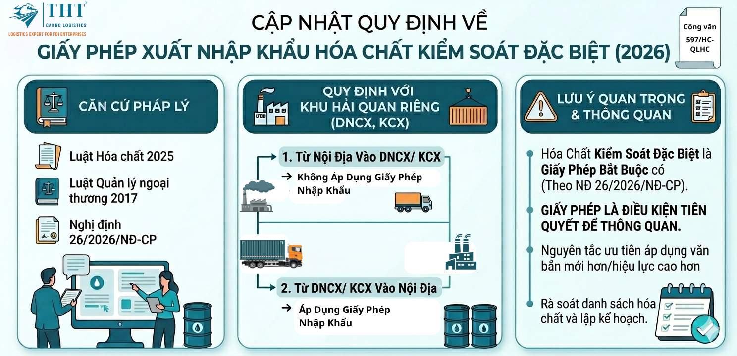 CẬP NHẬT QUY ĐỊNH CẤP GIẤY PHÉP XUẤT NHẬP KHẨU HÓA CHẤT KIỂM SOÁT ĐẶC BIỆT (2026) Cục Hóa chất – Bộ Công Thương vừa có cập nhật quan trọng liên quan đến việc cấp Giấy phép xuất khẩu, nhập khẩu đối với hóa chất thuộc danh mục kiểm soát đặc biệt. Đây là nội
