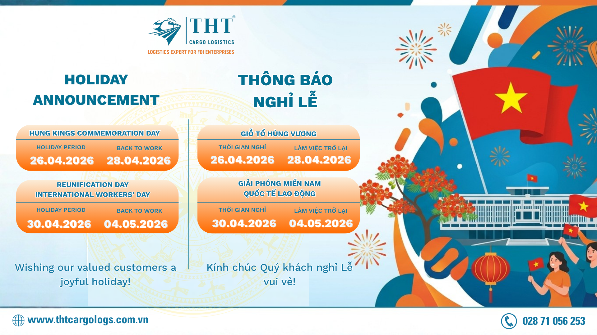 📢 THÔNG BÁO LỊCH NGHỈ LỄ GIỖ TỔ HÙNG VƯƠNG & 30/4 – 1/5/2026 THT Cargo Logistics xin trân trọng thông báo đến Quý Khách Hàng và Quý Đối Tác lịch nghỉ các ngày lễ lớn sắp tới nhằm giúp Quý vị chủ động trong kế hoạch vận chuyển và công việc. Giỗ Tổ Hùng